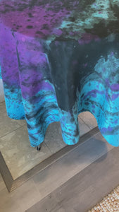Gorgeous blues and purples merge together. Beautiful Hand-painted Tablecloth adds festivity to your environment. Machine wash cold water, tumble dry. Remove promptly to avoid wrinkles.