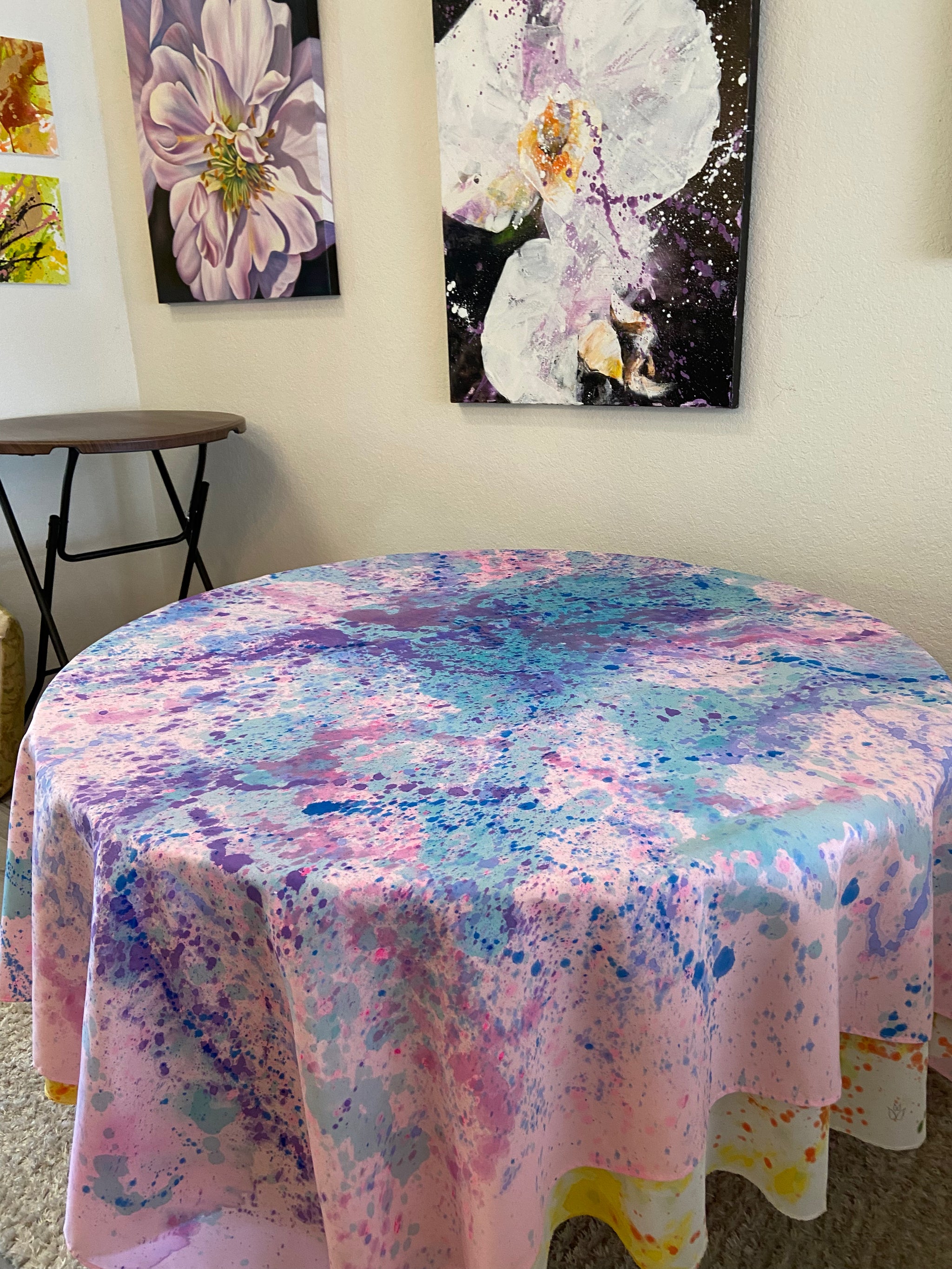 Beautiful Hand-painted Tablecloth adds festivity to your environment.  Machine wash cold water, tumble dry.  Remove promptly to avoid wrinkles.