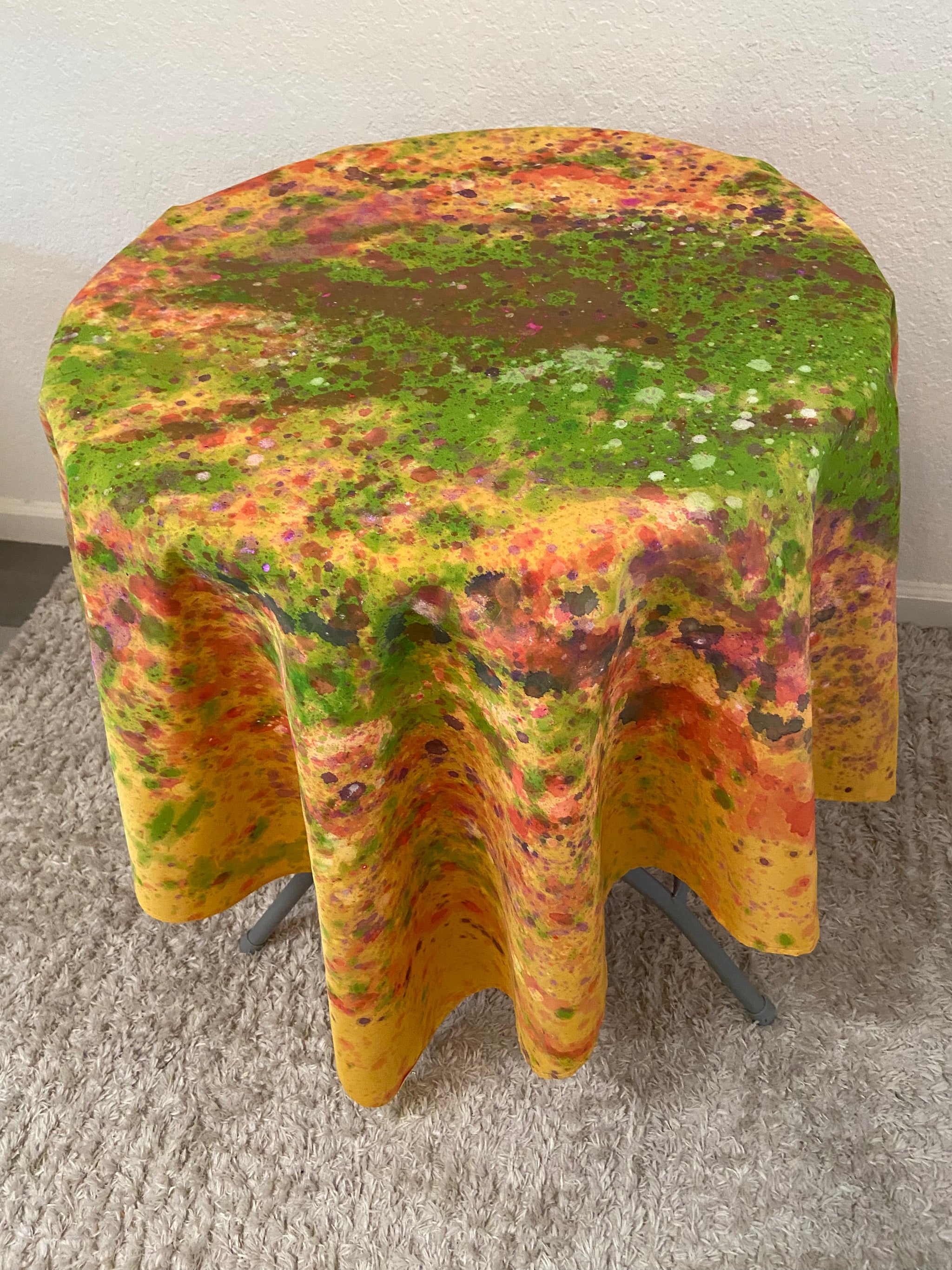 Beautiful Hand-painted Tablecloth adds festivity to your environment.  Machine wash cold water, tumble dry.  Remove promptly to avoid wrinkles.